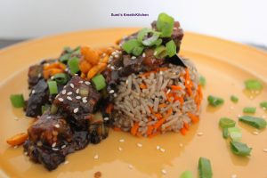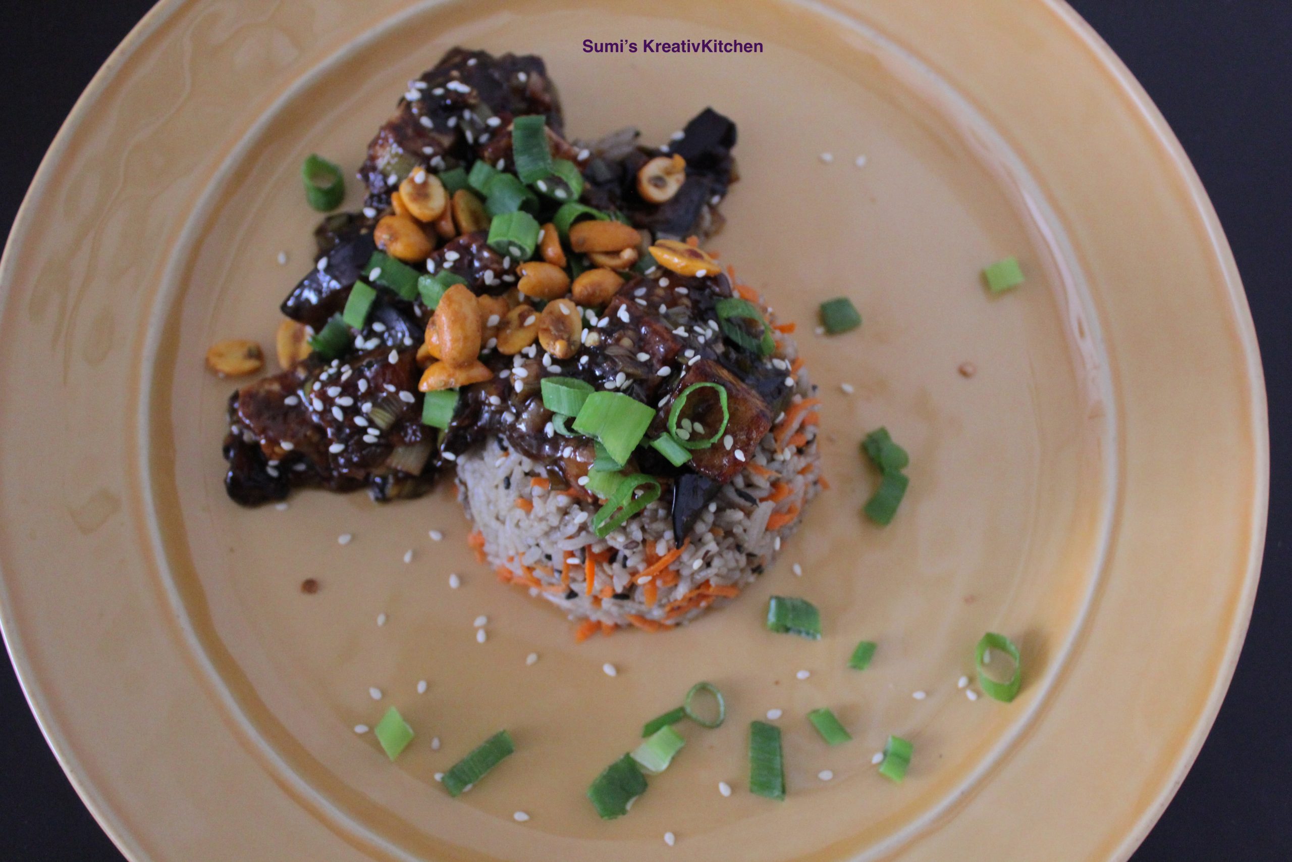 So, on a cold, rainy day when I was craving some spicy comfort food, here is what our plates looked like: Burnt garlic fried rice and crispy eggplant and tofu in a velvetty sauce.