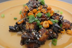 Note: If you don’t have an airfryer: Heat oil in a wok. Add tofu in a SINGLE layer. LEAVE IT ALONE!! On medium heat. It will turn brown and firm. Gently turn each cube to the other side. Allow it to brown again. Take them out on a plate. Keep it aside. Same process with the eggplant.